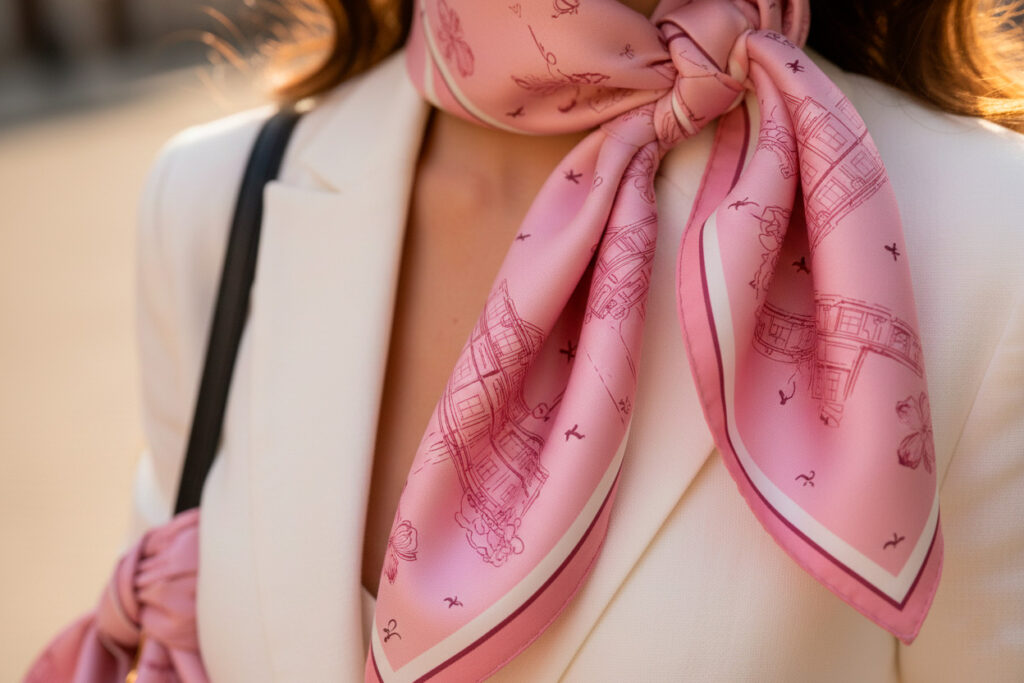 El estampado ha sido creado de manera original, cuidando la composición, el equilibrio cromático y la repetición del motivo, con el objetivo de transmitir elegancia y arraigo a través de un accesorio versátil.